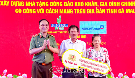 Đồng hành cùng tỉnh Cà Mau trong công tác đền ơn đáp nghĩa và an sinh xã hội, chiều 19/3, tại ấp Thới Bình, xã Thới Bình, Bộ Công an tổ chức bàn giao nhà mẫu và trao kinh phí xây dựng 500 căn nhà cho gia đình chính sách, hộ dân có hoàn cảnh khó khăn trên địa bàn tỉnh Cà Mau, với tổng kinh phí 40 tỷ đồng.