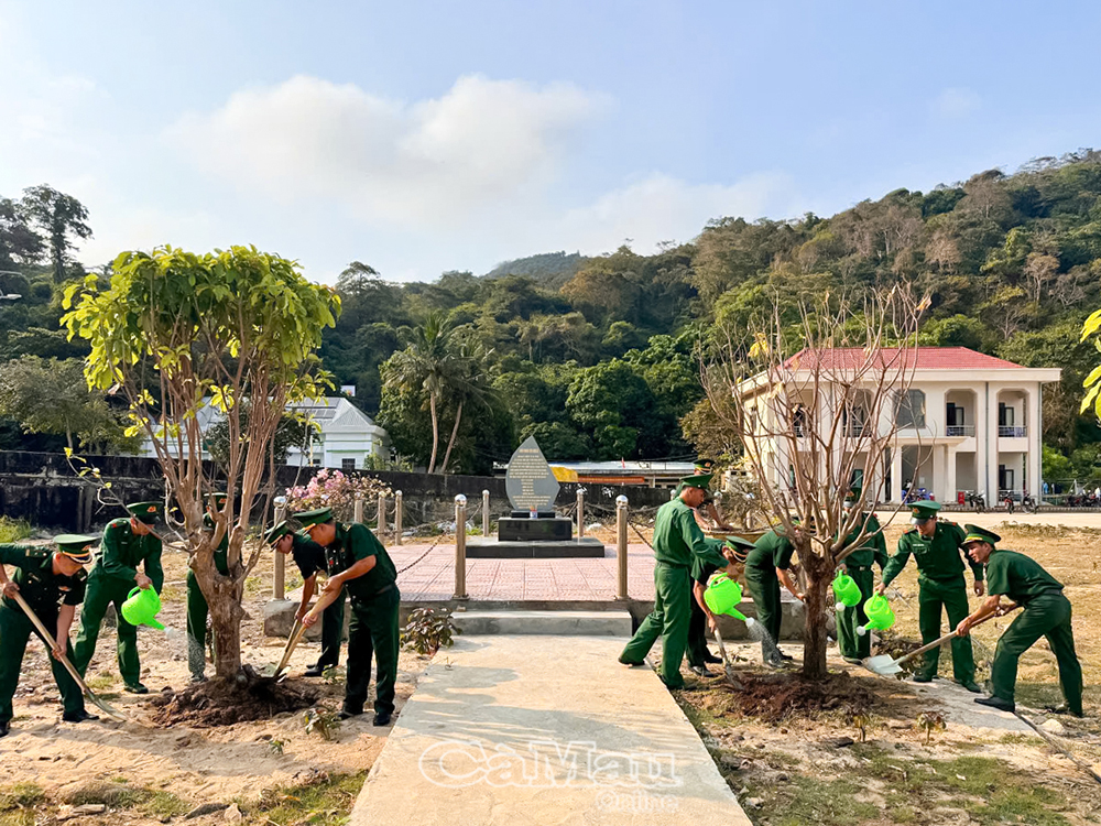 Cán bộ, chiến sĩ Đồn Biên phòng Hòn Khoai ra quân trồng cây.