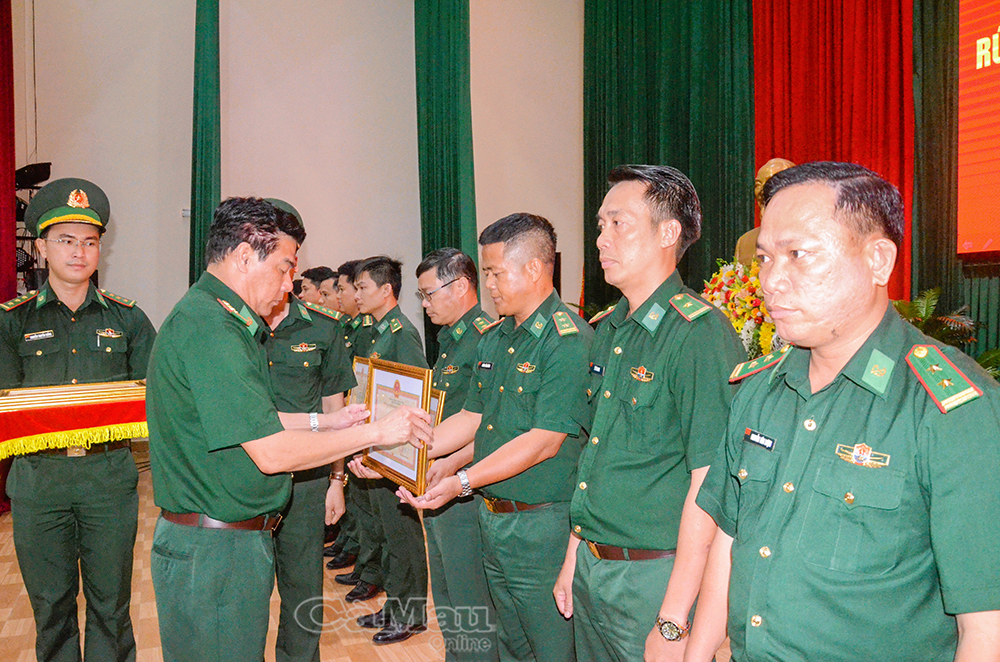 Đại tá Hà Văn Thanh, Chỉ huy trưởng Ban Chỉ huy BĐBP tỉnh Cà Mau, trao giấy khen cho các cá nhân có thành tích tiêu biểu trong thực hiện mô hình mới.