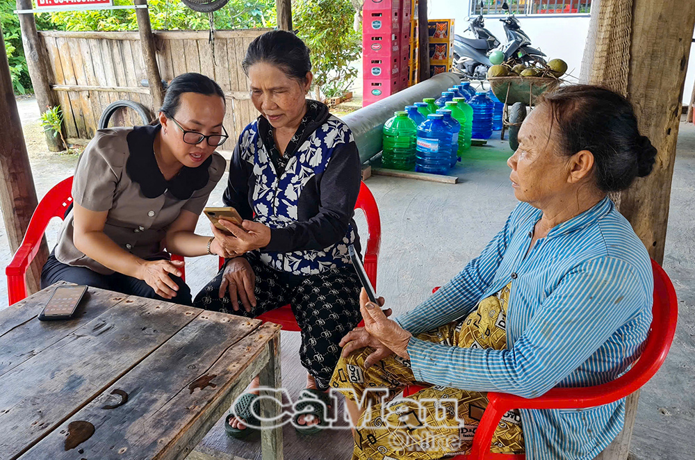 Cán bộ xã Định Thành hướng dẫn người dân sử dụng điện thoại mua sắm hàng hoá trên các sàn thương mại điện tử, chợ Online.