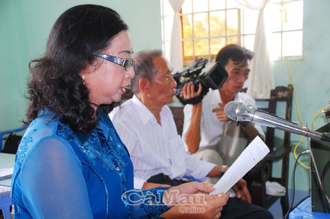 | Chị Lê Ngọc Diễm (tác giả) cùng ê-kíp tái hiện lại lời xướng theo cùng nhạc hiệu của Đài Truyền thanh tỉnh Minh Hải nhân kỷ niệm 35 năm thành lập. Ảnh: Minh Tấn |