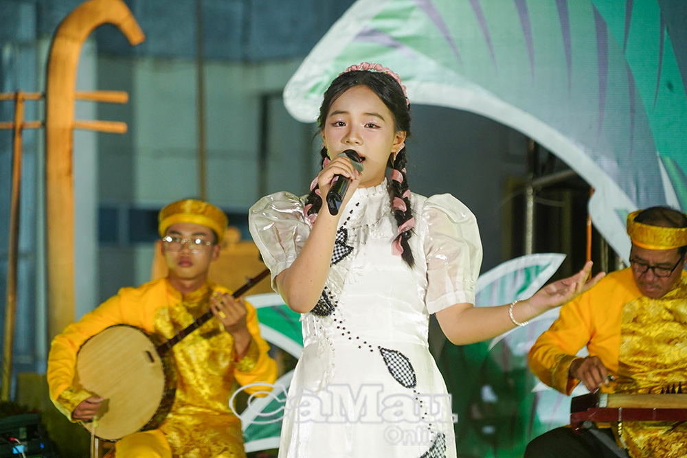 Bé Hà Linh, đội Đờn ca tài tử Cà Mau, biểu diễn bài Liên Nam “Bạc Liêu điểm hẹn”, đoạt giải A.