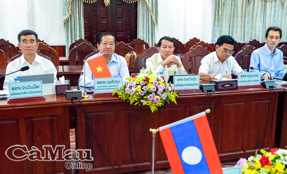 Đồng chí Lê Thanh Triều, Uỷ viên Ban Thường vụ Tỉnh uỷ, Phó Chủ tịch Thường trực Uỷ ban MTTQ Việt Nam tỉnh Cà Mau và ông Văn Lơn Pủi May Ni, Uỷ viên Ban Thường vụ Tỉnh uỷ, Chủ tịch Uỷ ban Mặt trận Lào xây dựng đất nước tỉnh Bô Ly Khăm Xay, đồng chủ trì cuộc hội đàm.