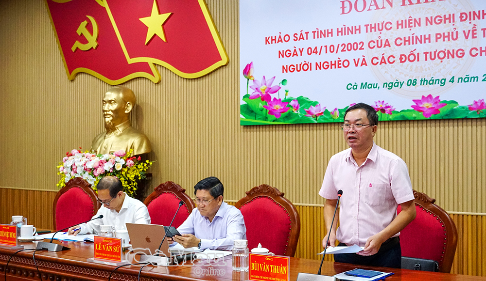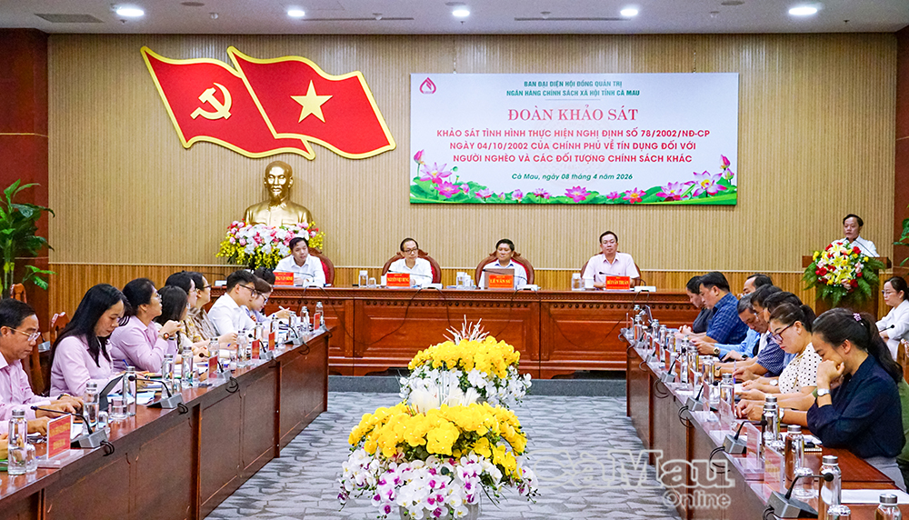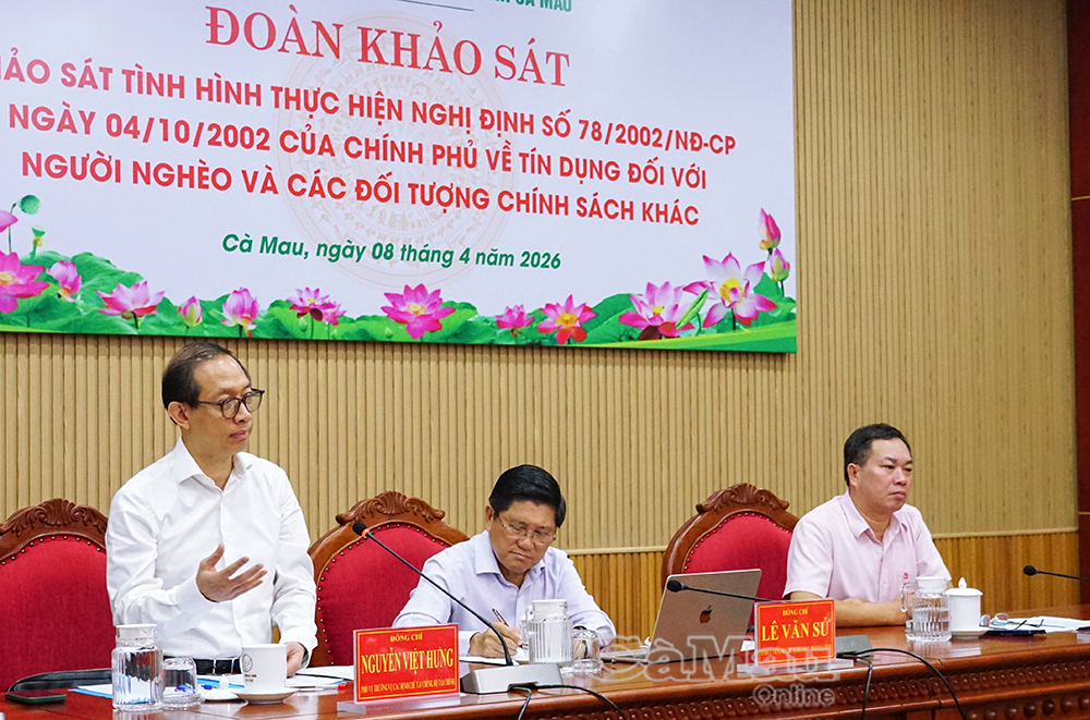 Sáng 8/4, Phó Chủ tịch UBND tỉnh Cà Mau Lê Văn Sử cùng Ban đại diện Hội đồng quản trị Ngân hàng Chính sách xã hội (NHCSXH) tỉnh tiếp và làm việc với đoàn khảo sát của Bộ Tài chính do ông Nguyễn Việt Hưng, Phó Vụ trưởng Vụ Các định chế tài chính, làm trưởng đoàn về triển khai thực hiện Nghị định số 78/2002/NĐ-CP về tín dụng đối với người nghèo và các đối tượng chính sách khác (Nghị định 78). Tham dự có Phó Tổng giám đốc NHCSXH Vương Văn Minh.