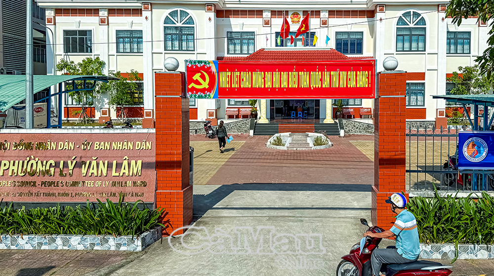 Trụ sở phường Lý Văn Lâm treo khẩu hiệu chào mừng Đại hội XIV của Đảng.