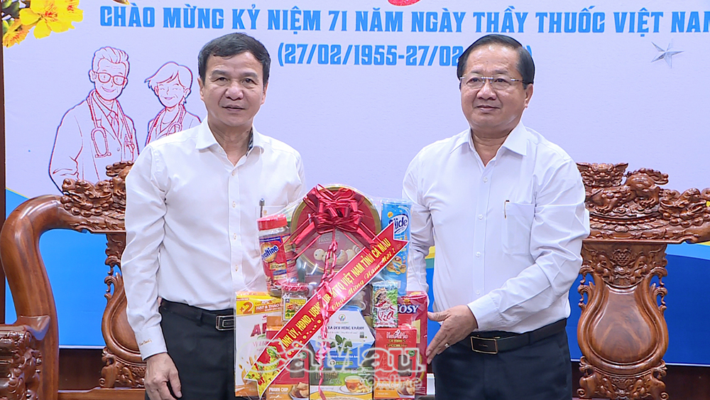 Đồng chí Lê Thanh Triều, Uỷ viên Ban Thường vụ Tỉnh uỷ, Phó Chủ tịch Thường trực Uỷ ban MTTQ Việt Nam tỉnh Cà Mau (bên phải), chúc Tết, tặng quà Bệnh viện Thống Nhất.