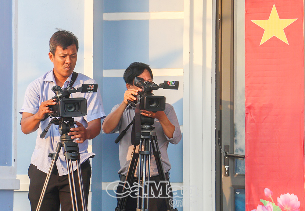 Các cơ quan thông tấn, báo chí đã góp sức to lớn cho thành công ngày bầu cử tại Cà Mau. Trong ảnh: Phóng viên Thông tấn xã Việt Nam (bên trái), phóng viên Báo và phát thanh, truyền hình Cà Mau đưa tin ngày bầu cử sớm tại đảo Hòn Chuối (Ấp 1, xã Sông Đốc, tỉnh Cà Mau) sáng 13/3/2026.