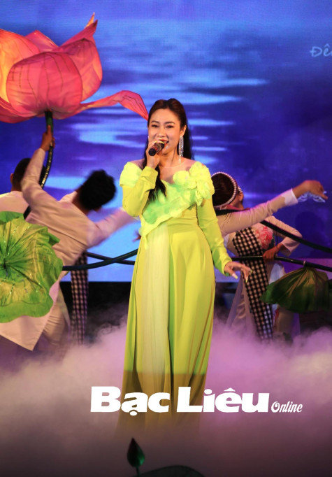 Ca sĩ Kiều Nghi biểu diễn tiết mục “Nghệ An - Bạc Liêu nghĩa nặng tình sâu”. Ảnh: NVCC