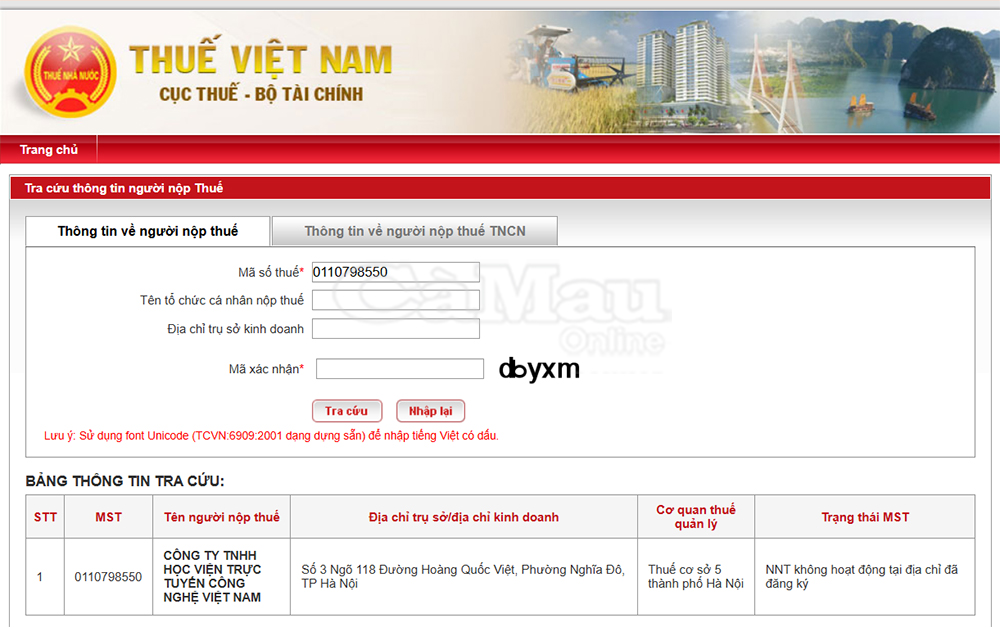 Thông tin tra cứu từ hệ thống thuế cho thấy, Công ty TNHH Học viện Trực tuyến Công nghệ Việt Nam không hoạt động tại địa chỉ đã đăng ký. (Chụp màn hình)