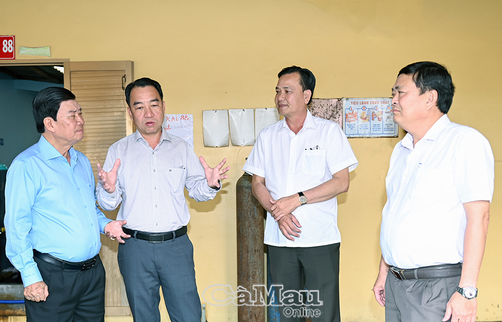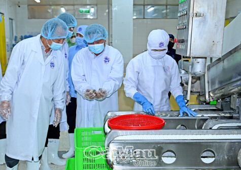 Phó Bí thư Tỉnh uỷ, Chủ tịch UBND tỉnh Lữ Quang Ngời (bìa trái) tìm hiểu quy trình sản xuất tại Công ty Cổ phần Chế biến và Dịch vụ Thuỷ sản Cà Mau - Chi nhánh xã Gành Hào.