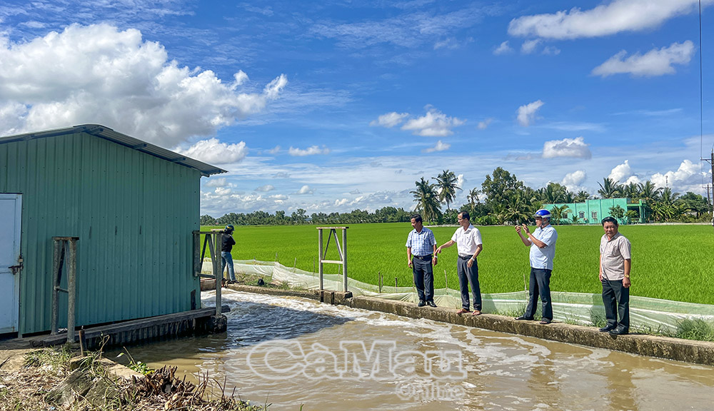 Lãnh đạo xã Vĩnh Thanh kiểm tra vận hành trạm bơm để bảo vệ vùng sản xuất lúa của nông dân trên địa bàn.