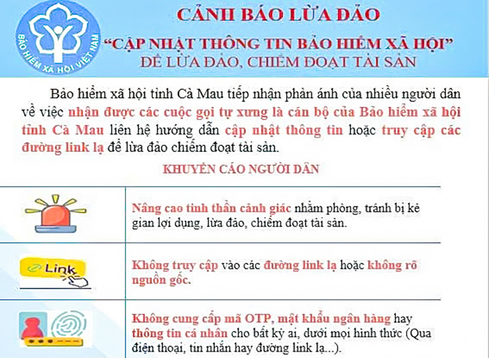 Trước tình trạng trên trên, ông Trịnh Trung Kiên, Phó Giám đốc BHXH tỉnh Cà Mau, khẳng định: “BHXH không bao giờ gọi điện yêu cầu người dân cung cấp thông tin cá nhân, số sổ BHXH hay CCCD để cập nhật hồ sơ. Dữ liệu của người dân được quản lý tập trung và tự động cập nhật; mọi thông báo chính thức đều thực hiện bằng văn bản, không qua điện thoại”.