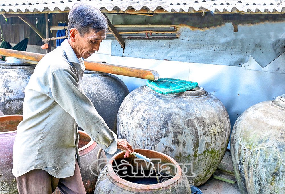 Ông Trần Văn Khởi (ấp Thanh Tùng, xã Biển Bạch) phải canh hứng nước vì đường ống cấp nước nhỏ, xa khu vực lắp đặt, chưa đáp ứng nhu cầu sử dụng của người dân.