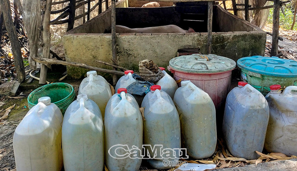 Ngoài nhu cầu sinh hoạt, bà con còn tận dụng can đựng nước lấy từ ao, đìa trong rừng để phục vụ chăn nuôi. (Ảnh chụp tại hộ ông Nguyễn Văn Ðồng, Ấp 19, Xã Nguyễn Phích).