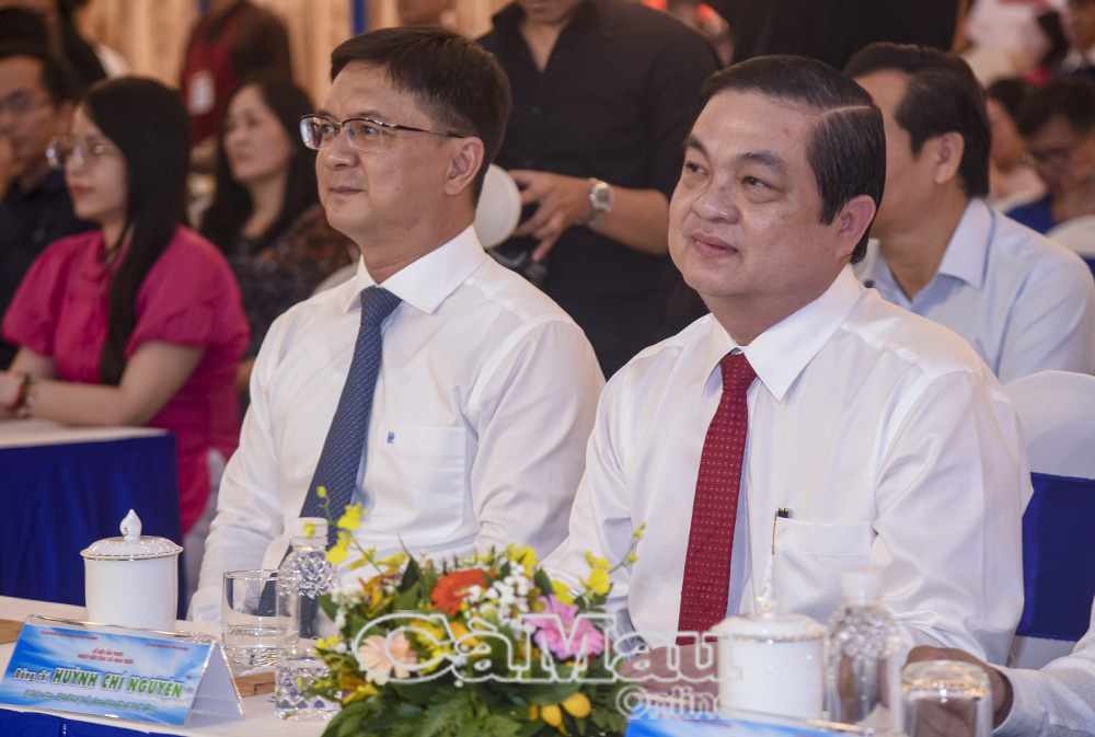 Đồng chí Nguyễn Mạnh Cường, Phó Chủ tịch UBND TP Hồ Chí Minh (bìa trái) và đồng chí Huỳnh Chí Nguyện, Phó Chủ tịch UBND tỉnh Cà Mau, dự khai mạc Lễ hội.