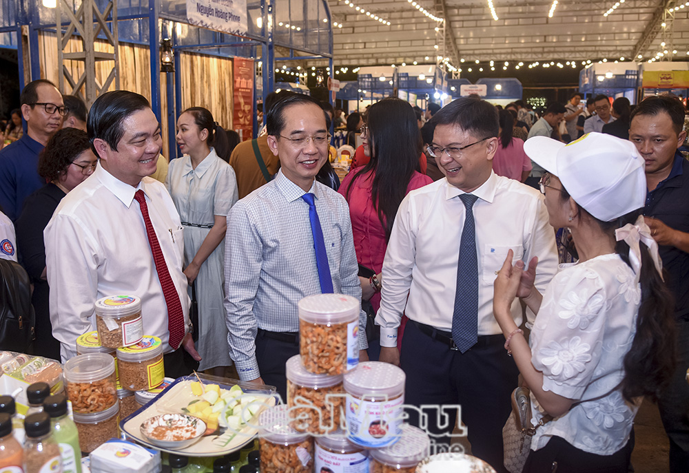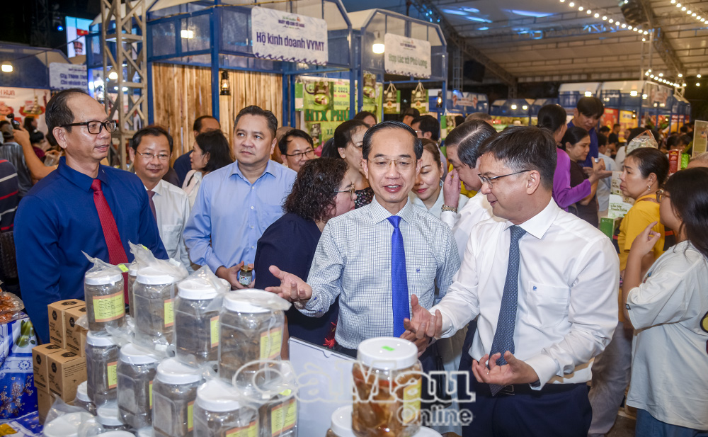 Lãnh đạo TP Hồ Chí Minh và tỉnh Cà Mau tham quan khu trưng bày đặc sản, sản phẩm OCOP đặc trưng của Cà Mau.