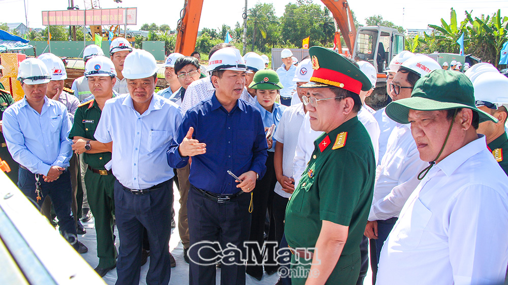 Đoàn đã kiểm tra hiện trường cầu Sông Ông Đốc 1 (xã Khánh An). Đây là một trong những hạng mục trọng điểm của dự án. Tại đây, Đại tá Lê Xuân Long, Giám đốc Ban Quản lý Dự án 166 (Bộ Quốc phòng), đã báo cáo chi tiết tiến độ và công tác tổ chức thi công.