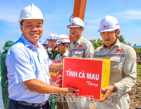 Đồng chí Huỳnh Quốc Việt, Phó Bí thư Thường trực Tỉnh uỷ Cà Mau, tặng quà chúc mừng năm mới đến toàn thể Ban Quản lý Dự án 166 và các nhà thầu thi công cao tốc đoạn Cà Mau - Cái Nước.