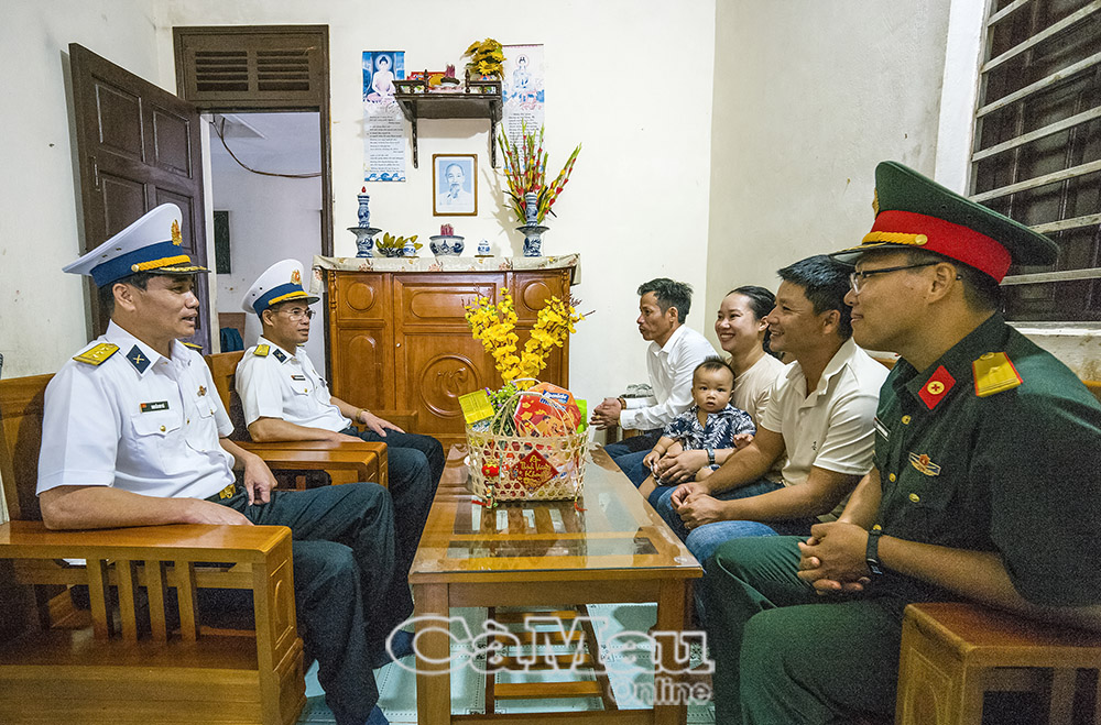 Thượng tá Nguyễn Duy Bá, Chủ nhiệm Chính trị Lữ đoàn 146 (bìa trái), cùng Thượng tá Nguyễn Văn Khương, Chính trị viên đảo Song Tử Tây, đến thăm và chúc Tết gia đình anh Phan Ngọc Vương tại đảo Song Tử Tây.