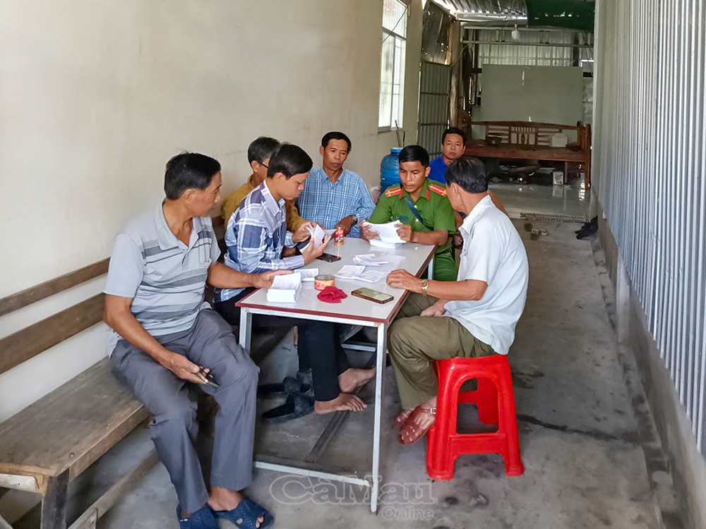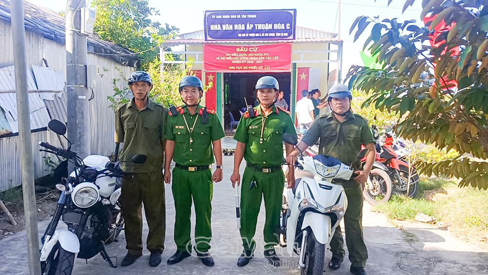 Lực lượng Công an xã Tân Thuận rà soát, đảm bảo an ninh trật tự tại khu vực bỏ phiếu.