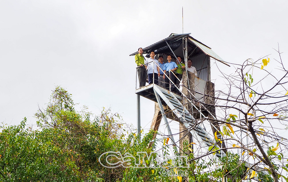 Giám đốc Sở Nông nghiệp và Môi trường tỉnh Cà Mau Tô Hoài Phương khảo sát công tác ứng trực từ trên chòi canh lửa và kiểm tra PCCR mùa khô tại Khu bảo tồn loài, sinh cảnh Vườn chim Bạc Liêu tỉnh Cà Mau, ngày 24/2. Ảnh VĂN BẠCH