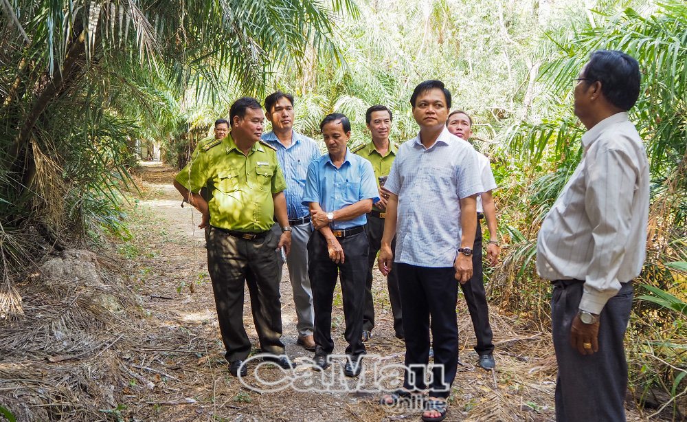 Giám đốc Sở Nông nghiệp và Môi trường Tô Hoài Phương (hàng đầu, thứ hai từ phải sang) kiểm tra công tác ứng trực trên chòi canh lửa và PCCCR mùa khô tại khu bảo tồn loài, sinh cảnh Vườn chim Bạc Liêu (phường Hiệp Thành), vào ngày 24/2 vừa qua. Hiện toàn bộ 75 ha rừng tự nhiên ở đây đều khô cạn, dự báo cháy cấp III (cấp cao).