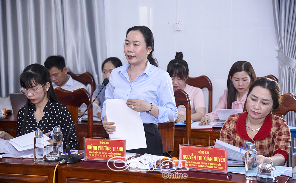 Đồng chí Huỳnh Phương Thanh, Phó Chủ tịch HĐND, Phó Chủ tịch Uỷ ban Bầu cử phường Vĩnh Trạch, báo cáo tình hình triển khai công tác bầu cử trên địa bàn.