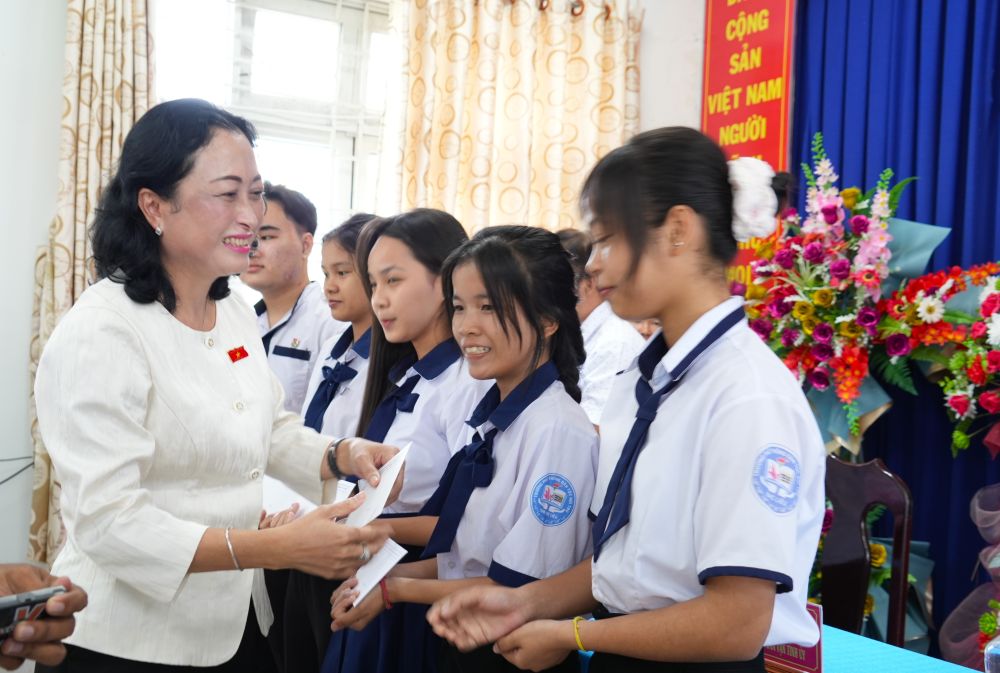 Chủ tịch Hội đồng Dân tộc của Quốc hội Lâm Văn Mẫn và Phó Chủ tịch Hội đồng Dân tộc của Quốc hội Trần Thị Hoa Ry tặng quà mừng năm mới cho các em học sinh dân tộc Khmer tiêu biểu.