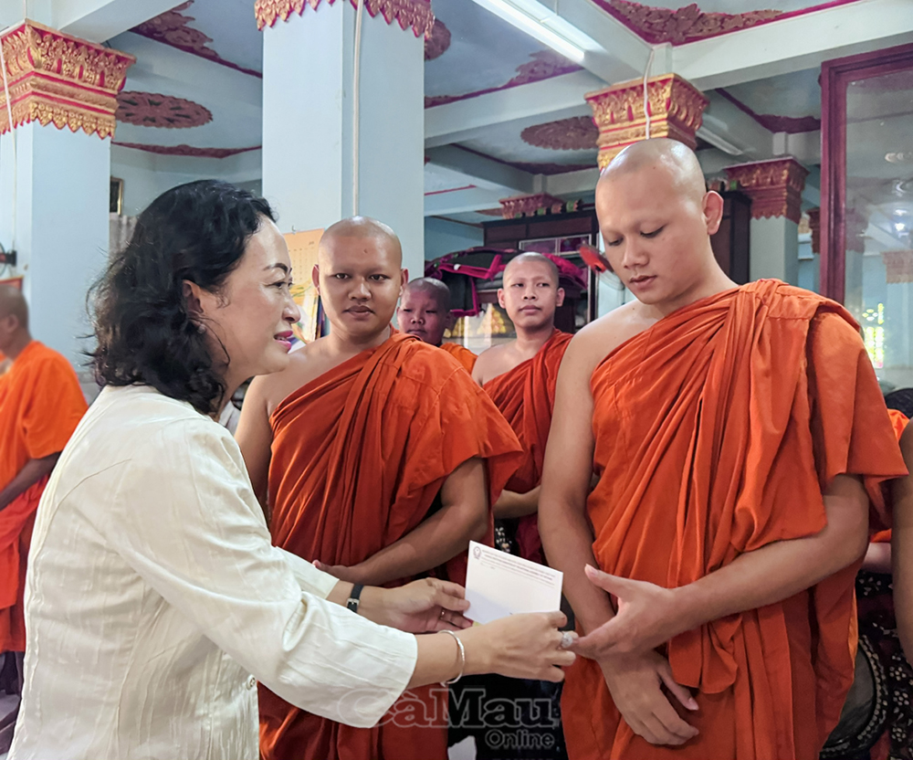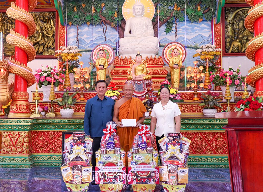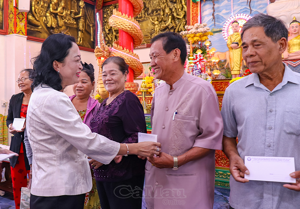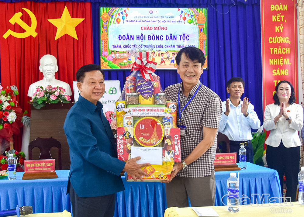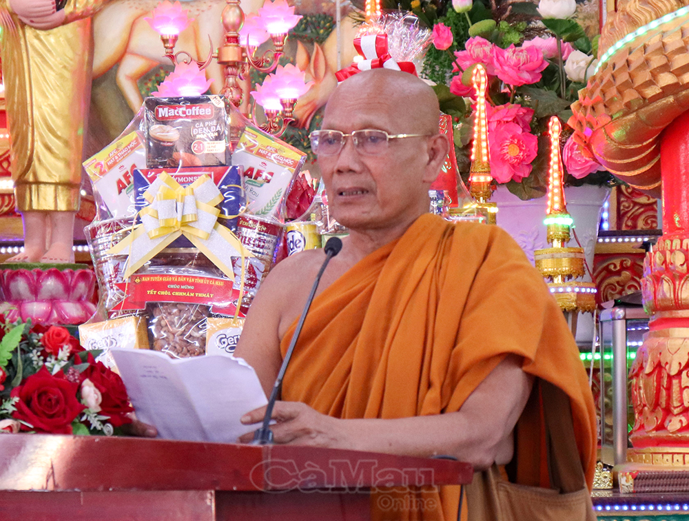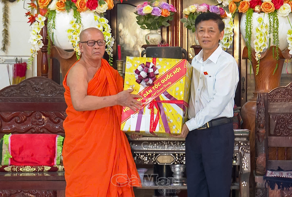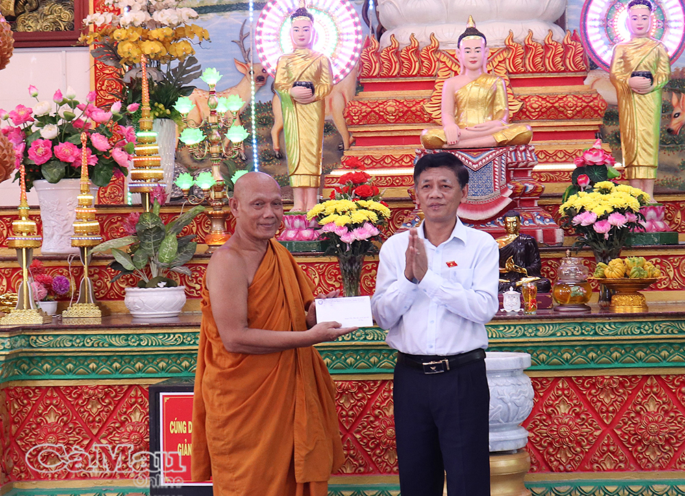 Thay mặt lãnh đạo Tỉnh uỷ, HĐND, UBND, Uỷ ban MTTQ Việt Nam tỉnh Cà Mau, đồng chí Hồ Trung Việt, Uỷ viên Ban Thường vụ Tỉnh uỷ, Trưởng ban Tuyên giáo và Dân vận Tỉnh uỷ, cùng đồng chí Nguyễn Thu Tư, Giám đốc Sở Dân tộc và Tôn giáo, tặng quà tết Chôl Chnăm Thmây đến Hội Đoàn kết sư sãi yêu nước tỉnh và chùa Monivongsa Bopharam.