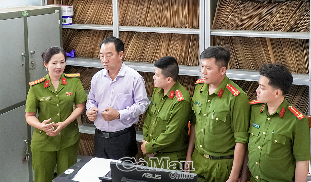 Đồng chí Lữ Quang Ngời, Phó Bí thư Tỉnh uỷ, Chủ tịch UBND tỉnh (thứ 2, từ phải sang), khảo sát hạ tầng, nơi làm việc và điều kiện sinh hoạt của cán bộ, chiến sĩ Công an Xã Trần Phán.