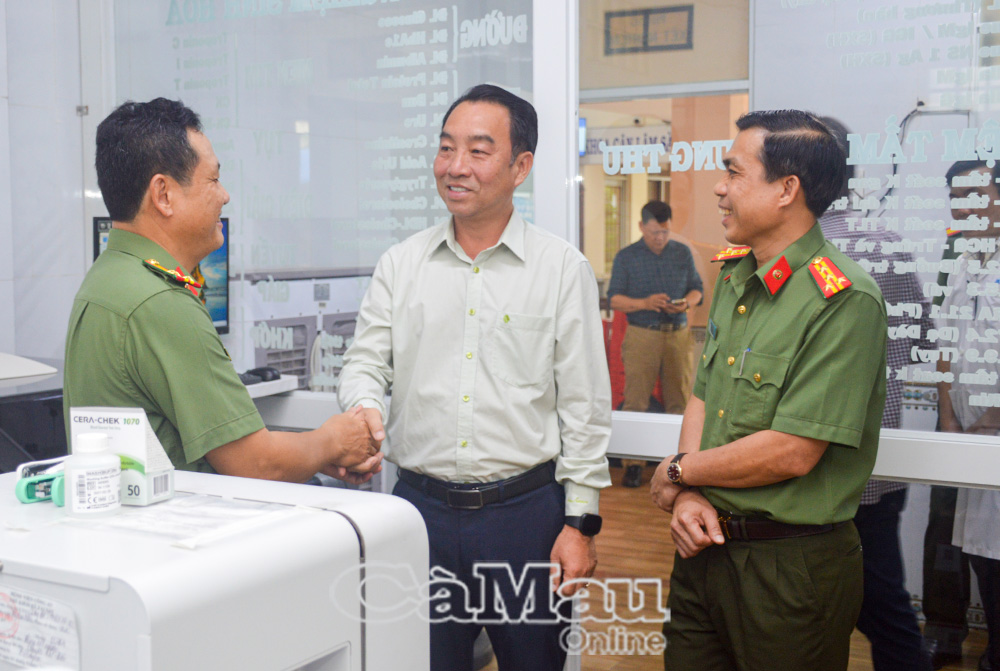 Chủ tịch UBND tỉnh Lữ Quang Ngời đến tham quan một số phòng chức năng tại Bệnh viện Công an tỉnh Cà Mau.