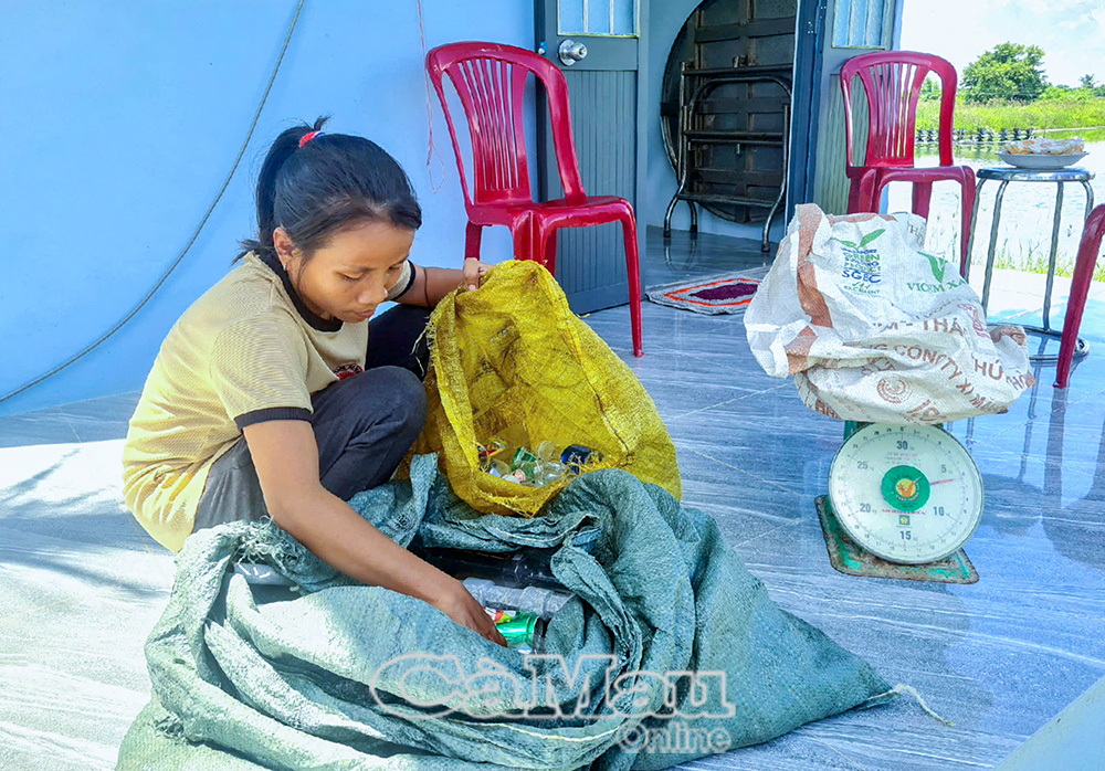 Chị Trần Thị Hồng Gấm cân phế liệu sau một ngày thu mua.
