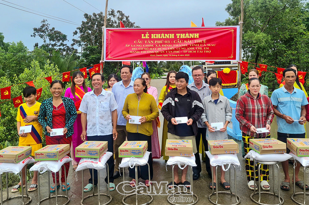 UBND xã Định Thành vận động mạnh thường quân trao tặng cầu giao thông nông thôn và quà các hộ gia đình có hoàn cảnh khó khăn.