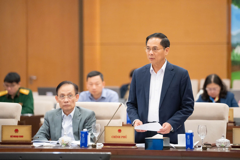 Bộ trưởng Ngoại giao Lê Hoài Trung trình bày tờ trình tại phiên họp. (Ảnh: DUY LINH)