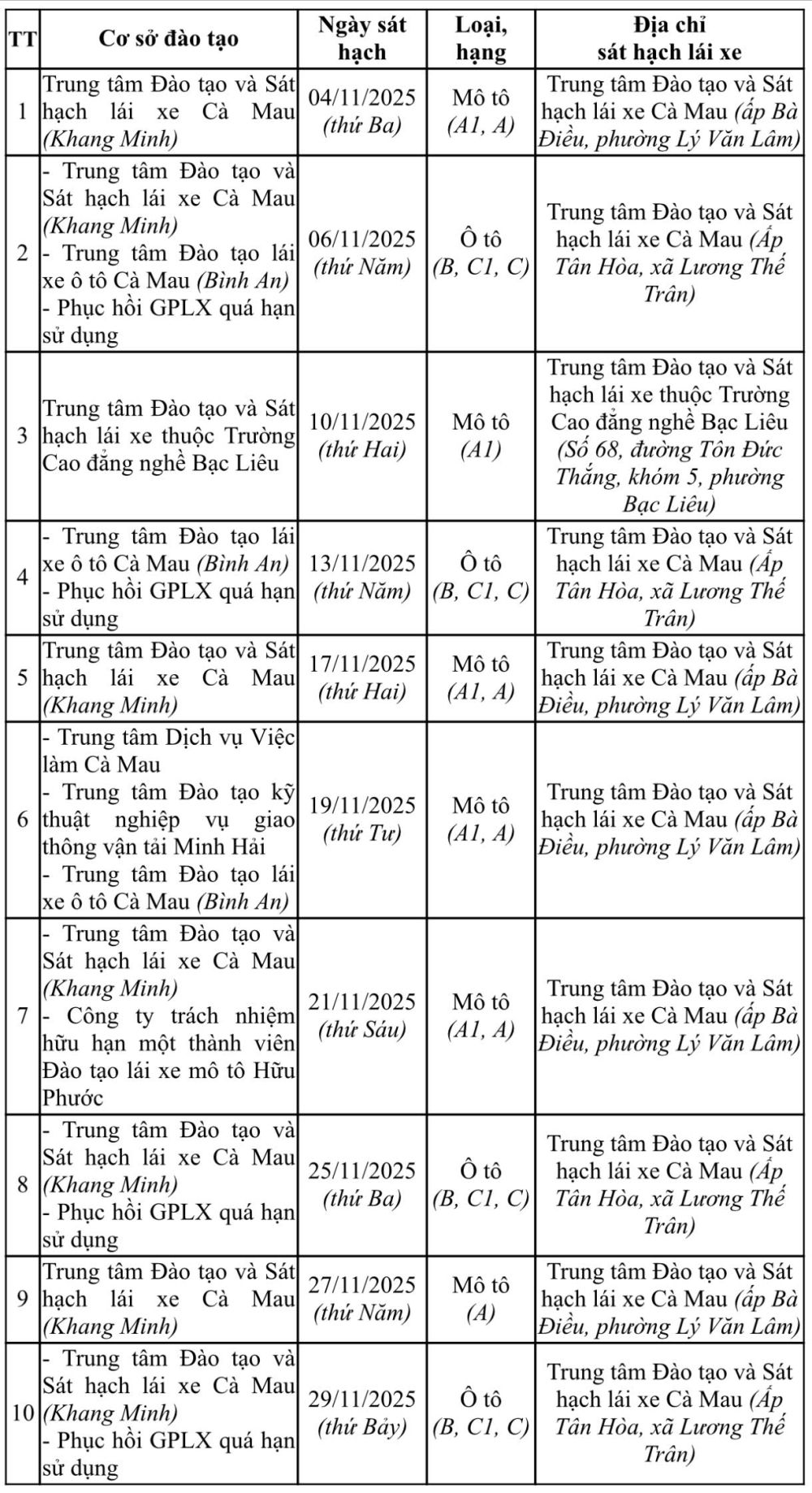 Báo Cà Mau Nhằm bảo đảm nhu sát hạch, cấp giấy phép lái xe (GPLX) của công dân trên địa bàn tỉnh không gián đoạn, Phòng Cảnh sát giao thông, Công an tỉnh Cà Mau sẽ tổ chức 10 kỳ sát hạch cấp giấy phép lái xe trong tháng 11/2025 cho các hạng mô tô và ô tô.