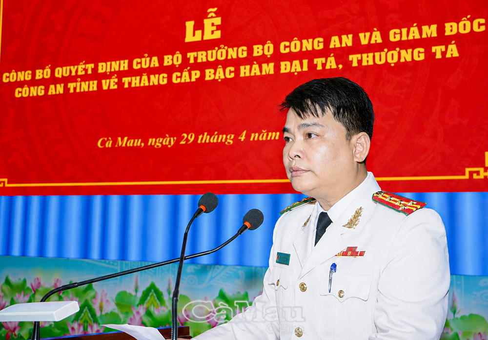 Bày tỏ niềm vinh dự, tự hào, thay mặt các đồng chí được thăng cấp bậc hàm, Đại tá Phan Hoài Vũ, Trưởng phòng Tham mưu, Công an tỉnh khẳng định sẽ tiếp tục nêu cao tinh thần trách nhiệm, không ngừng học tập, rèn luyện bản lĩnh chính trị và phẩm chất đạo đức cách mạng; phát huy truyền thống vẻ vang của lực lượng Công an nhân dân, cùng tập thể đơn vị đoàn kết, hoàn thành xuất sắc nhiệm vụ bảo vệ an ninh trật tự, vì cuộc sống bình yên của Nhân dân.