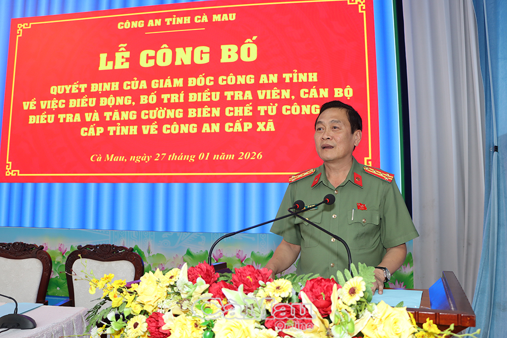 Ngày 27/1, Công an tỉnh Cà Mau tổ chức Lễ công bố quyết định điều động, tăng cường điều tra viên, cán bộ điều tra về Công an cấp xã và Hội nghị giao ban công tác Công an tháng 1/2026, sơ kết 1 tháng cao điểm tấn công, trấn áp tội phạm, bảo đảm ANTT Tết Nguyên đán Bính Ngọ 2026. Đại tá Hồ Việt Triều, Uỷ viên Ban Thường vụ Tỉnh uỷ, Giám đốc Công an tỉnh, chủ trì buổi lễ.