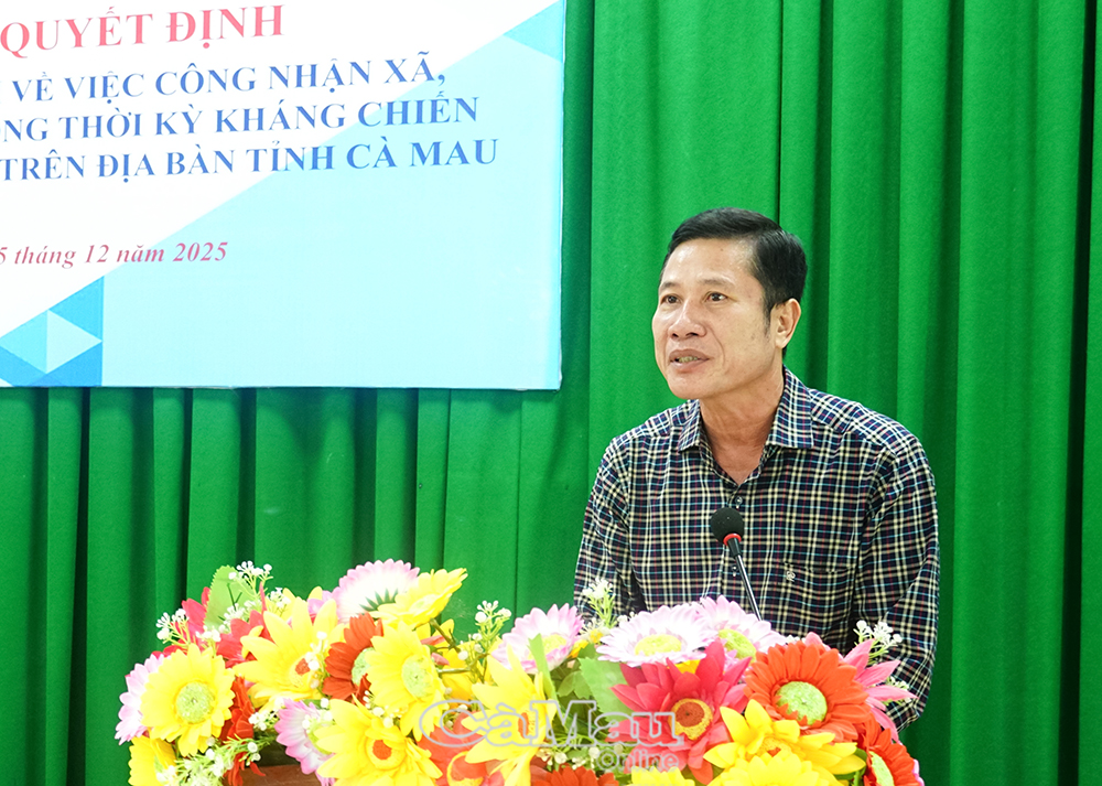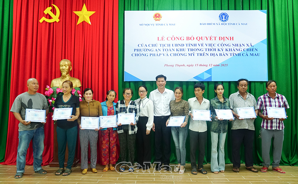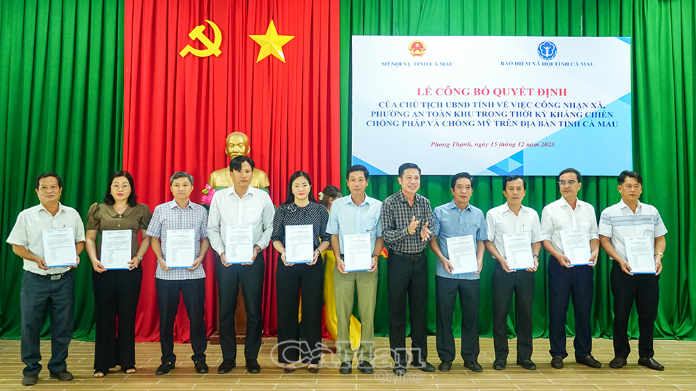 Chiều 15/12, tại UBND xã Phong Thạnh, Sở Nội vụ phối hợp với Bảo hiểm xã hội (BHXH) tỉnh Cà Mau, tổ chức Lễ công bố Quyết định của Chủ tịch UBND tỉnh về việc công nhận xã, phường An toàn khu trong thời kỳ kháng chiến chống thực dân Pháp và đế quốc Mỹ.