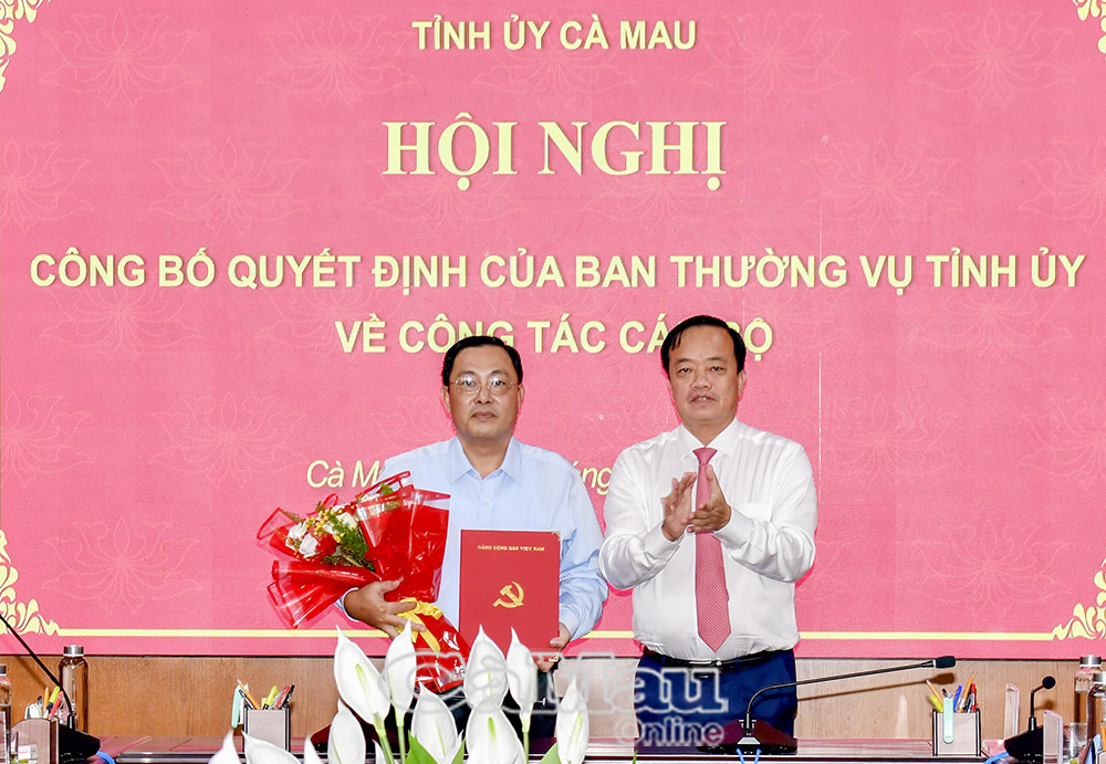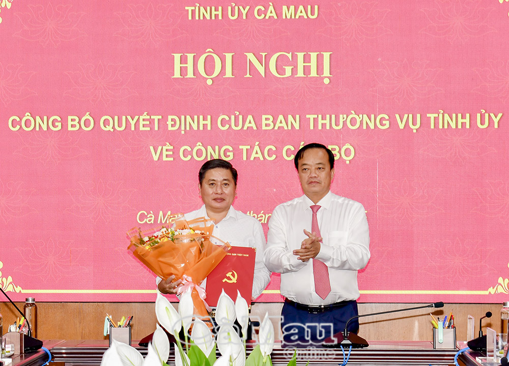 Phó Bí thư Thường trực Tỉnh uỷ Huỳnh Quốc Việt trao quyết định và tặng hoa chúc mừng đồng chí Nguyễn Minh Phụng.