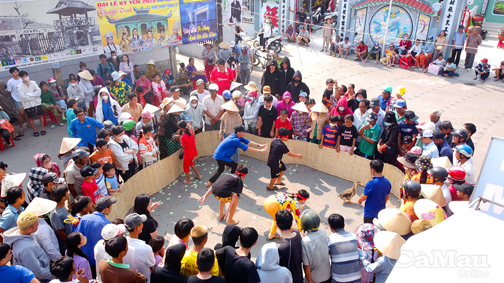 Người dân hào hứng tham gia trò chơi dân gian trong lễ hội Kỳ yên.