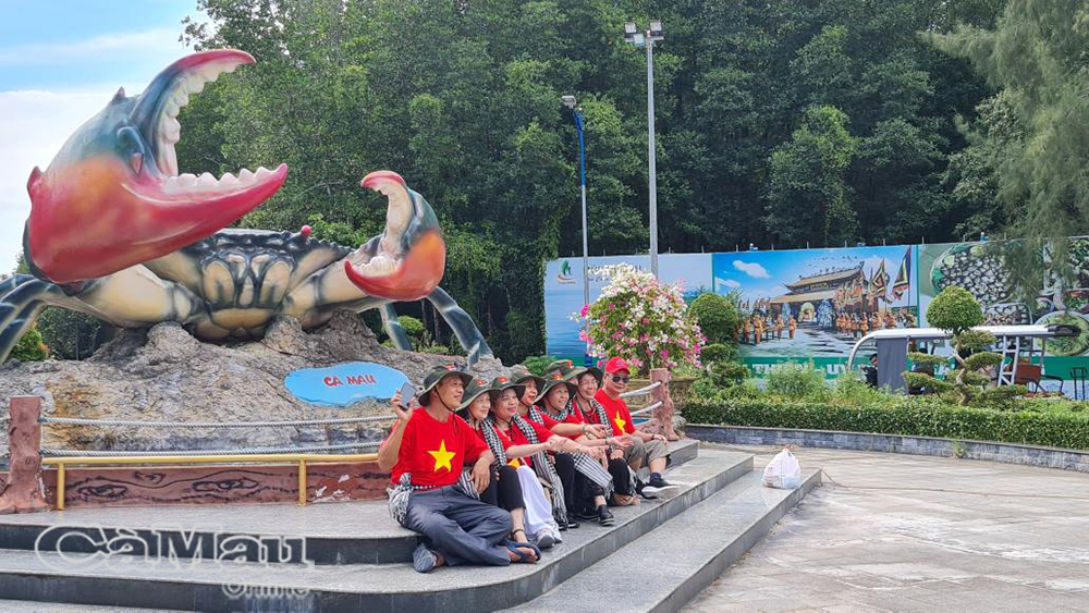 Du khách chụp ảnh lưu niệm tại biểu tượng con cua ở Khu du lịch Mũi Cà Mau. (Ảnh tư liệu)