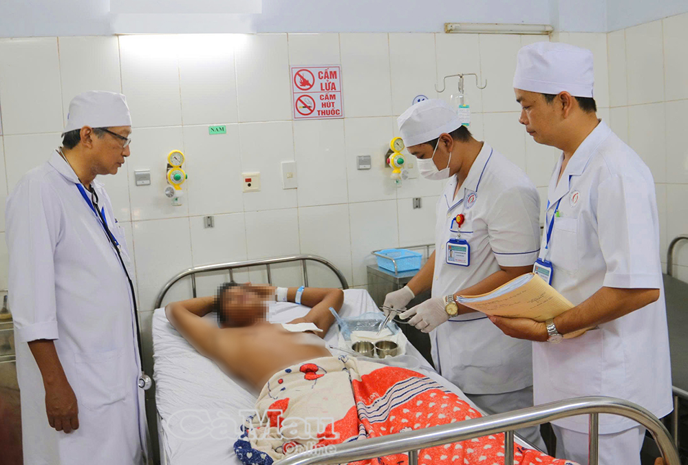 Bác sĩ CKII Trần Văn Triệu, Trưởng khoa Ngoại tổng hợp (bên trái), trực tiếp thăm khám, kiểm tra sức khoẻ cho bệnh nhân L.T.Đ sau ca phẫu thuật.
