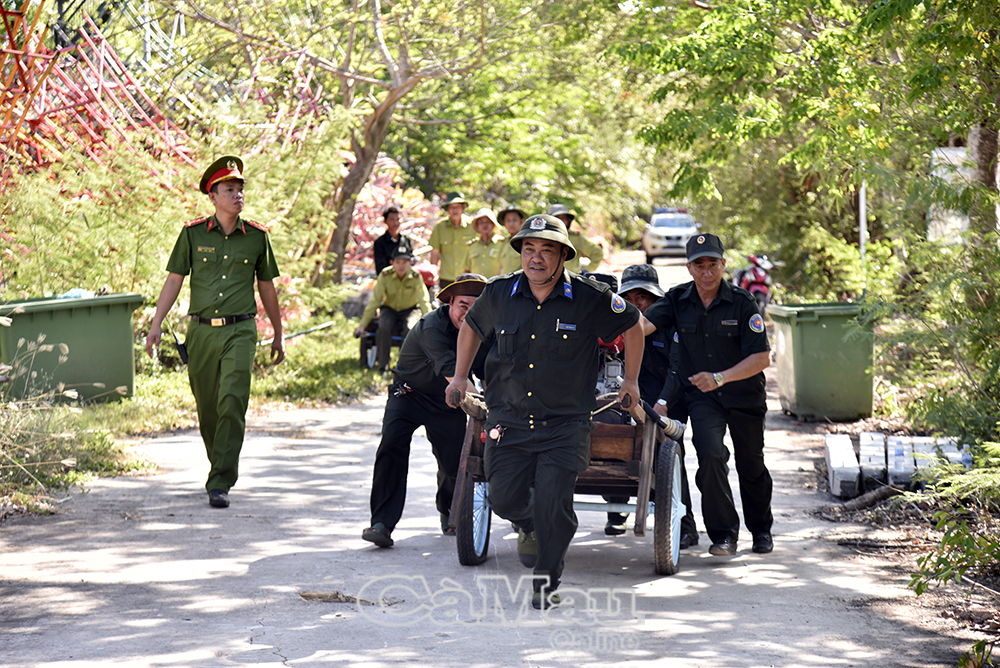 Hơn 100 cán bộ, chiến sĩ, nhân viên của 2 đơn vị, cùng lực lượng kiểm lâm, quân đội và người dân phường Hiệp Thành, xã Vĩnh Hậu tham gia diễn tập.
