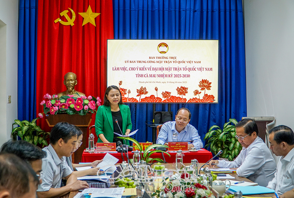 Báo Cà Mau Chiều 31/10, tại TP Hồ Chí Minh, Ban Thường trực Uỷ ban Trung ương MTTQ Việt Nam có buổi làm việc, cho ý kiến về công tác chuẩn bị Đại hội MTTQ Việt Nam tỉnh Cà Mau nhiệm kỳ 2025-2030.