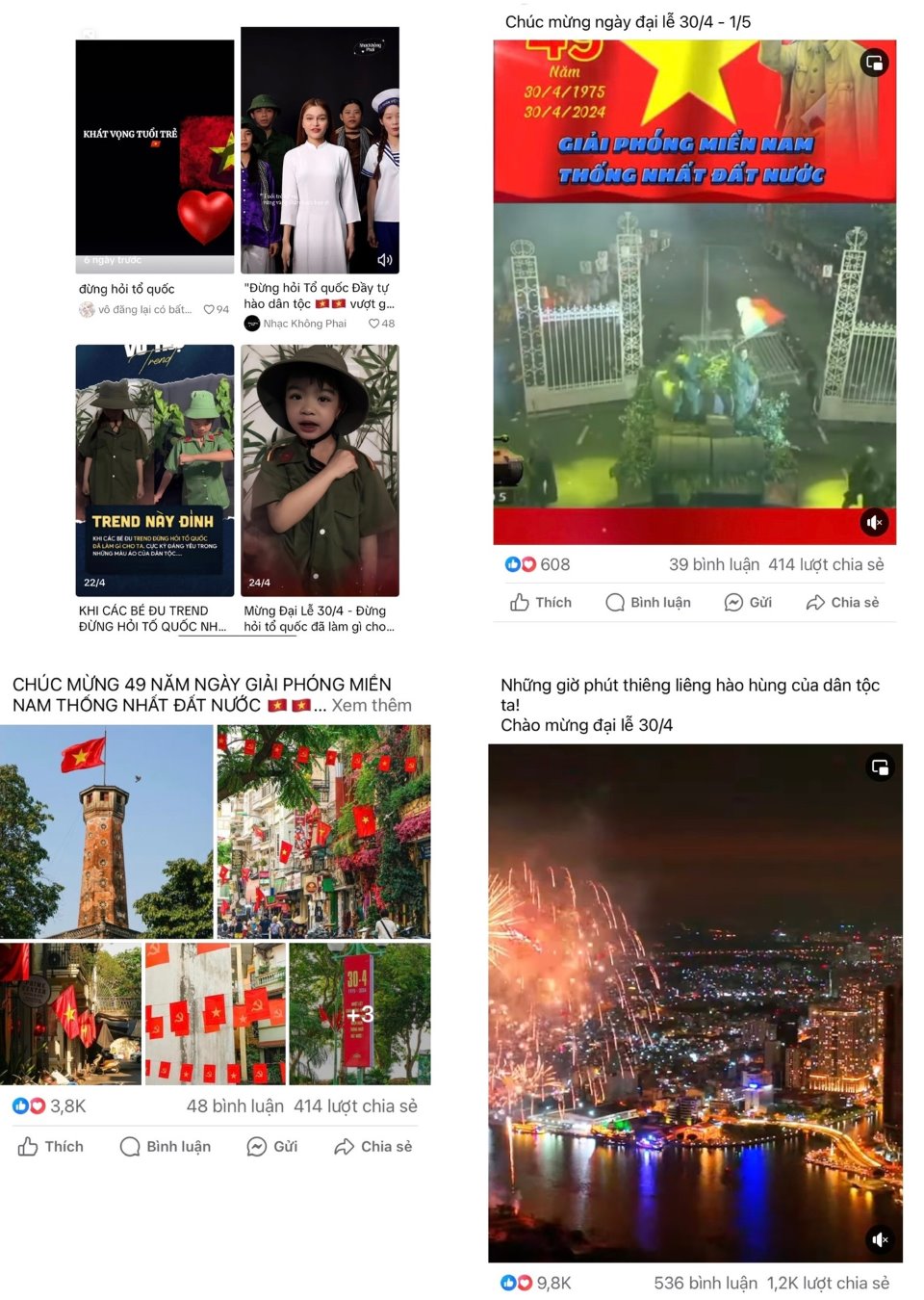 Cụ thể là đăng tải hình ảnh về những con đường rực rỡ cờ hoa; chương trình văn hóa - văn nghệ chào mừng; hoạt động thăm hỏi, tặng quà người có công, thắp hương tri ân các anh hùng liệt sĩ; chia sẻ lại những hình ảnh, thước phim tư liệu tái hiện chân thực khí thế ngất trời và niềm vui khôn xiết của quân và dân ta trong ngày “non sông thu về một mối”… Trong số đó, đặc biệt nhất là chiếc trend “Đừng hỏi Tổ quốc đã làm gì cho ta…”. Những clip của các bạn trẻ hóa thân thành nhiều nhân vật như: bộ đội, hải quân, giao liên, giáo viên, đoàn viên, bác sĩ… trên nền nhạc hào hùng của ca khúc “Khát vọng tuổi trẻ” gửi gắm thông điệp về tình yêu nước và bày tỏ lòng biết ơn của tuổi trẻ đối với thế hệ cha ông xả thân vì nước, đã nhận về “cơn mưa” lời khen.
