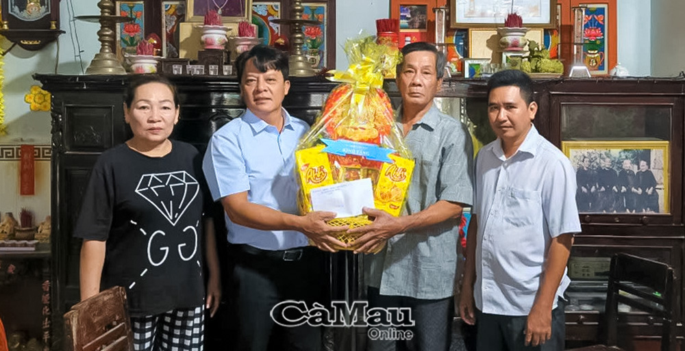Trước đó, lãnh đạo Xã Phan Ngọc Hiển tổ chức đoàn đến thăm, tặng quà các gia đình thân nhân 10 Anh hùng liệt sĩ Khởi nghĩa Hòn Khoai. (Trong ảnh: Ông Tiết Minh Khởi, Uỷ viên Ban Thường vụ Đảng uỷ, Phó Chủ tịch UBND Xã Phan Ngọc Hiển (thứ hai từ trái sang), trao quà đến thân nhân Liệt sĩ Đỗ Văn Sến). Ảnh: NHƯ LÊ