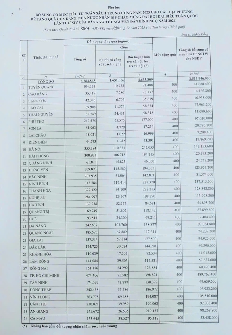 Cụ thể, bổ sung có mục tiêu từ ngân sách Trung ương cho các địa phương số tiền là 2.513.946 triệu đồng từ nguồn dự phòng ngân sách Trung ương năm 2025 được bổ sung theo Nghị quyết số 265/2025/QH15 ngày 11 tháng 12 năm 2025 của Quốc hội để thực hiện tặng quà của Đảng, Nhà nước nhân dịp chào mừng Đại hội đại biểu toàn quốc lần thứ XIV của Đảng và Tết Nguyên đán Bính Ngọ năm 2026.