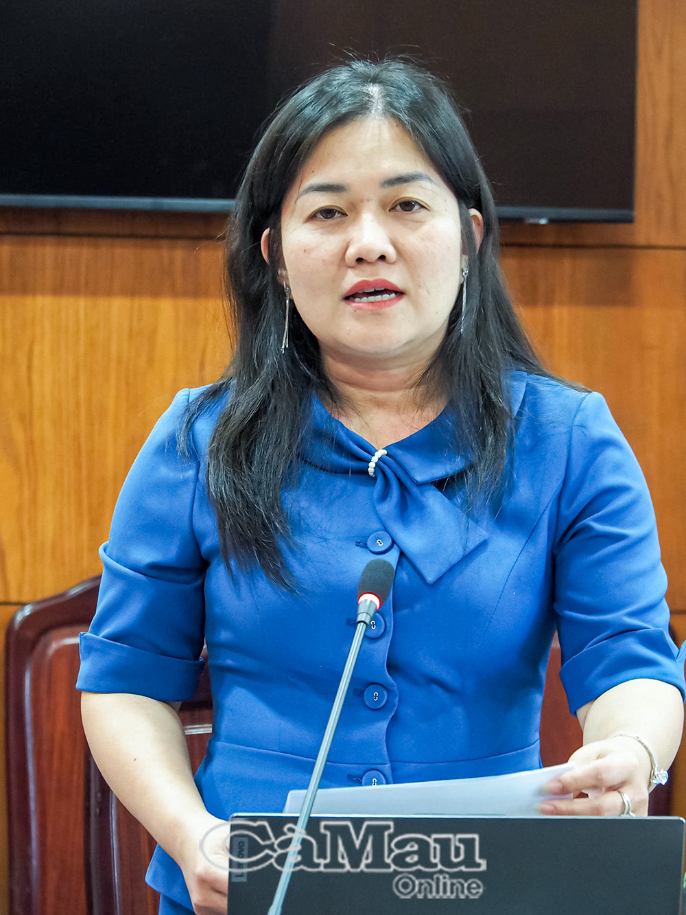 Đồng chí Võ Thị Ngọc Hân, Phó Chủ tịch Uỷ ban MTTQ Việt Nam tỉnh Cà Mau, trình bày tham luận “Đánh giá kết quả thực hiện việc học tập và làm theo tư tưởng, đạo đức, phong cách Hồ Chí Minh chuyên đề 2025 “Khát vọng phát triển đất nước phồn vinh, hạnh phúc” trong Đảng bộ”.