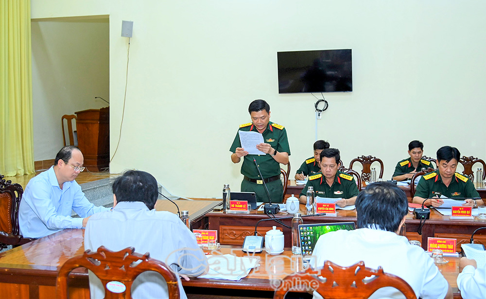 Đại tá Võ Thành Lê, Phó Bí thư Thường trực Đảng uỷ, Chính uỷ Bộ CHQS tỉnh, trình bày báo cáo kiểm điểm tập thể Ban Thường vụ Đảng uỷ Quân sự tỉnh.