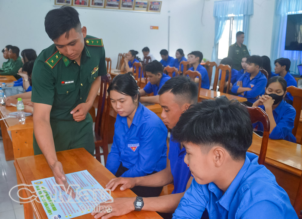 Ðồn Biên phòng Ðất Mũi phát tờ rơi tuyên truyền phòng, chống hành vi khai thác hải sản bất hợp pháp, tháng 8/2025. Ảnh: Trịnh Hải